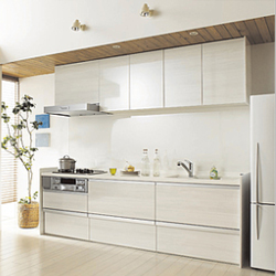 新規キッチン取付、給水配管接続、給湯配管接続、排水配管接続、ガスコンロ接続、換気扇ダクト接続替、電気結線(照明・換気扇)、廃材処分